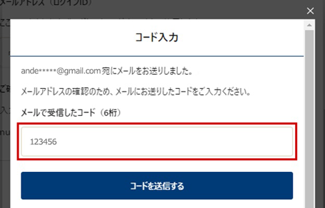 コード入力画面を閉じてしまった場合は、再度「メールアドレスにコードを送信する」を押してください。